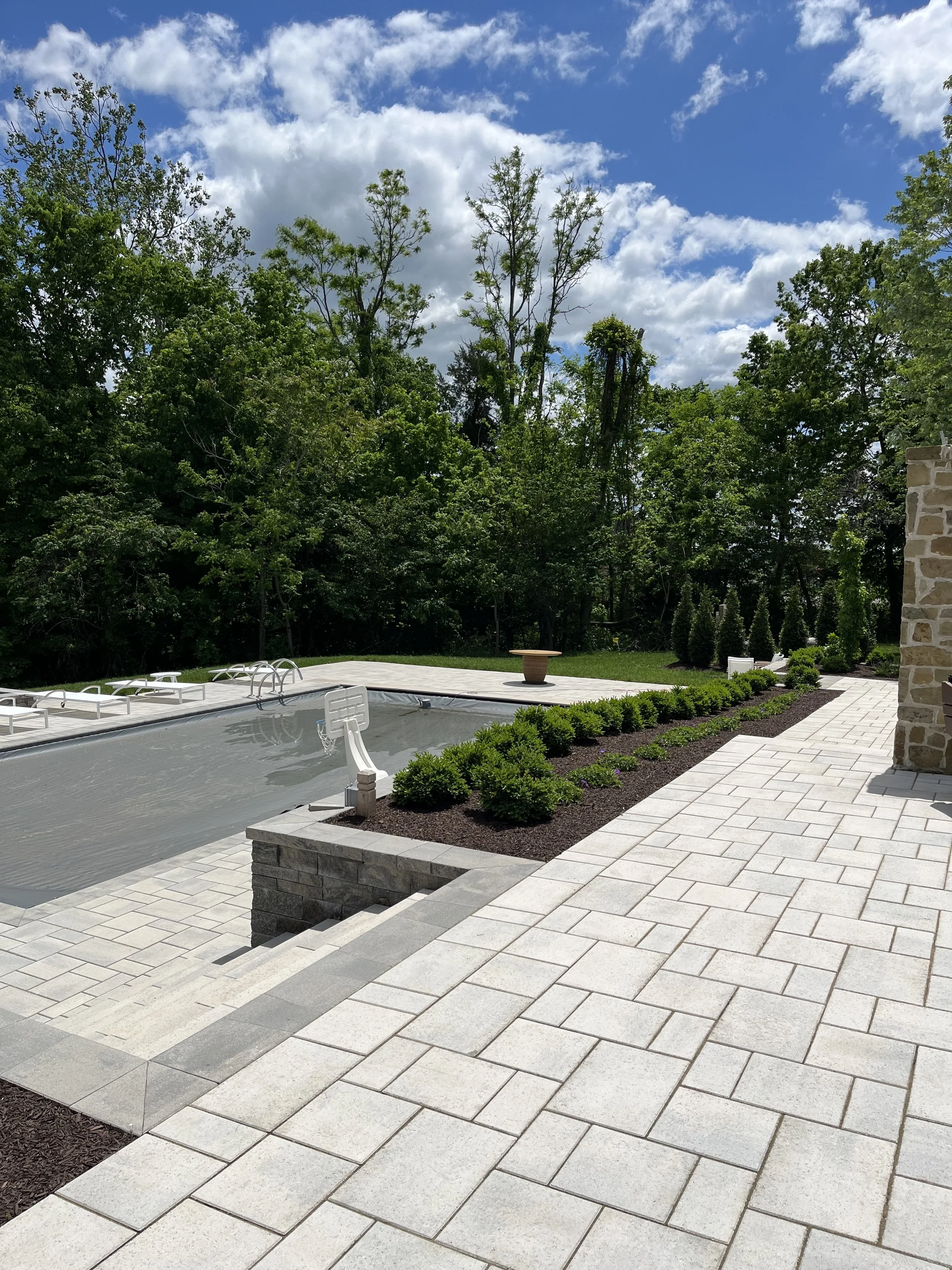 Patio Irregular True Blue Bluestone with Sand Joints & Kentucky Creekstone Masonry Wall with through-Wall Pondless Waterfall